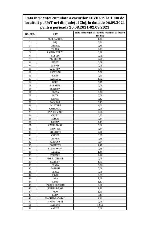 Actualitate Rata incidenței cumulate a cazurilor COVID-19 la 1000 de locuitori pe UAT-uri din județul Cluj, la data de 06.09.2021 pentru perioada 20.08.2021-02.09.2021 ziarul21.ro 6 septembrie 2021, 16:22 Share Tweet Share Share Email Comments Related Items:la data de 06.09.2021 pentru perioada 20.08.2021-02.09.2021, 📉 Rata incidenței cumulate a cazurilor COVID-19 la 1000 de locuitori pe UAT-uri din județul Cluj Share Tweet Share Share Email Recommended for you Rata incidenței cumulate a cazurilor COVID-19 la 1000 de locuitori pe UAT-uri din județul Cluj, la data de 23.07.2021 pentru perioada 06.07.2021-19.07.2021 Click to comment Leave a Reply Anulează răspunsulComentariile trebuie să respecte regulile de utilizare.Adresa ta de email nu va fi publicată. Câmpurile necesare sunt marcate cu *Comentariu * Nume * Email * Δ Acest site folosește Akismet pentru a reduce spamul. Află cum sunt procesate datele comentariilor tale.
