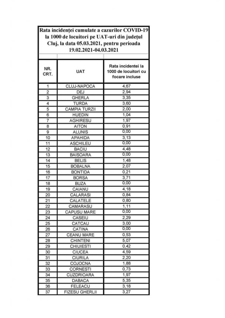 Actualitate Rata incidenței cumulate a cazurilor COVID-19 ziarul21.ro 5 martie 2021, 14:30 Share Tweet Share Share Email Comments Rata incidenței cumulate a cazurilor COVID-19 la 1000 de locuitori pe UAT-uri din județul Cluj, la data 05.03.2021, pentru perioada 19.02.2021-04.03.2021 Related Items:Rata incidenței cumulate a cazurilor COVID-19 Share Tweet Share Share Email Click to comment Leave a Reply Anulează răspunsulComentariile trebuie să respecte regulile de utilizare.Adresa ta de email nu va fi publicată. Câmpurile necesare sunt marcate cu *Comentariu * Nume * Email * Δ Acest site folosește Akismet pentru a reduce spamul. Află cum sunt procesate datele comentariilor tale.