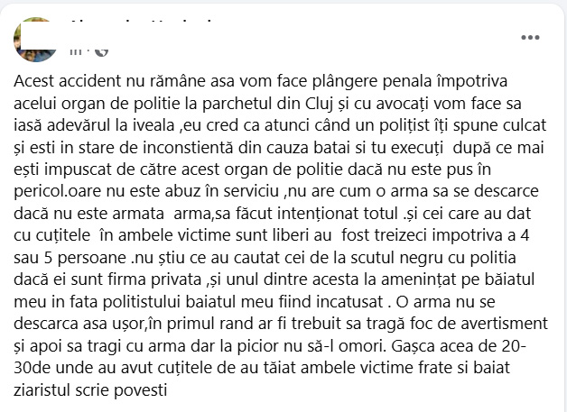 Autorul mesajului afirmă că persoana rănită nu ar fi reprezentat un pericol în momentul intervenției și pune sub semnul întrebării caracterul accidental al focului de armă. De asemenea, acesta susține că incidentul ar fi fost intenționat și critică modul de intervenție al forțelor de ordine.În același mesaj, sunt aduse acuzații și cu privire la desfășurarea conflictului, fiind menționată implicarea unui număr mare de persoane și utilizarea unor obiecte tăietor-înțepătoare.