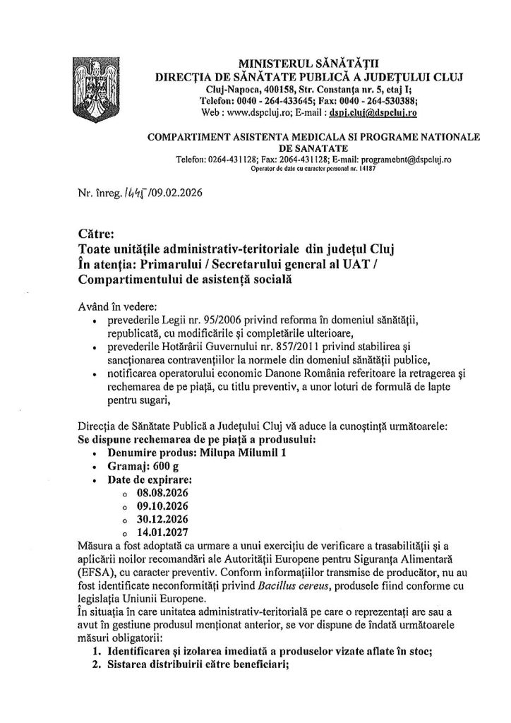 Vă informăm că DSP Cluj a solicitat în mod expres rechemarea de pe piață a produsului:
