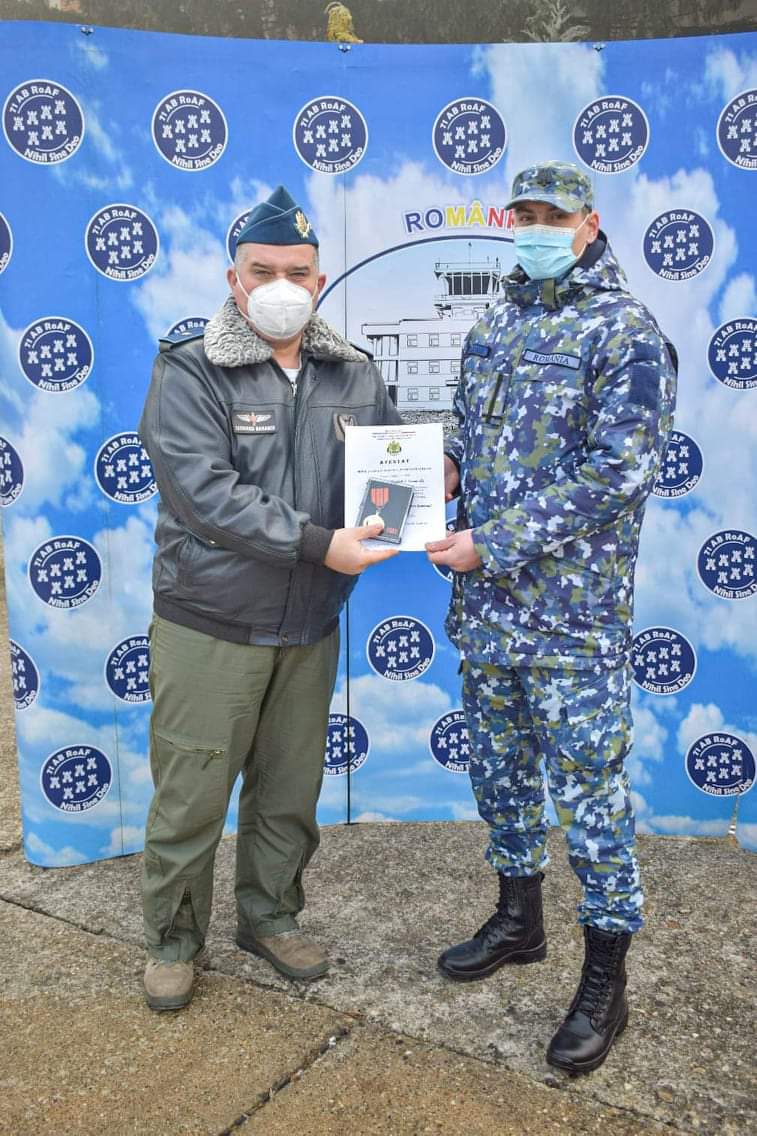 La Baza 71 Aeriană, astăzi, 11 februarie 2021, în semn de apreciere deosebită a profesionalismului manifestat în îndeplinirea cu responsabilitate a misiunilor încredințate, precum și a rezultatelor meritorii obținute în activitatea profesională desfășurată în Forțele Aeriene, s-a conferit Emblema de Onoare a Forțelor Aeriene domnului căpitan comandor Popica Ovidiu și domnului plutonier adjutant principal Diaconu Gabriel.