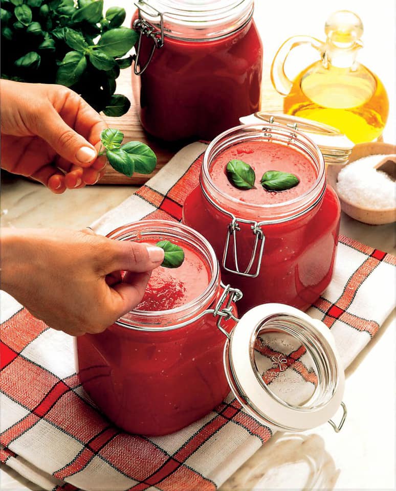 5. Se toarnă acest bulion de roșii în borcane curate şi se pun deasupra frunze de busuioc. Borcanele se închid ermetic. Se aşază borcanele într-o oală înaltă şi se adaugă apă până aproape de buza borcanelor. Oala se pune pe foc şi se lasă să dea un clocot.