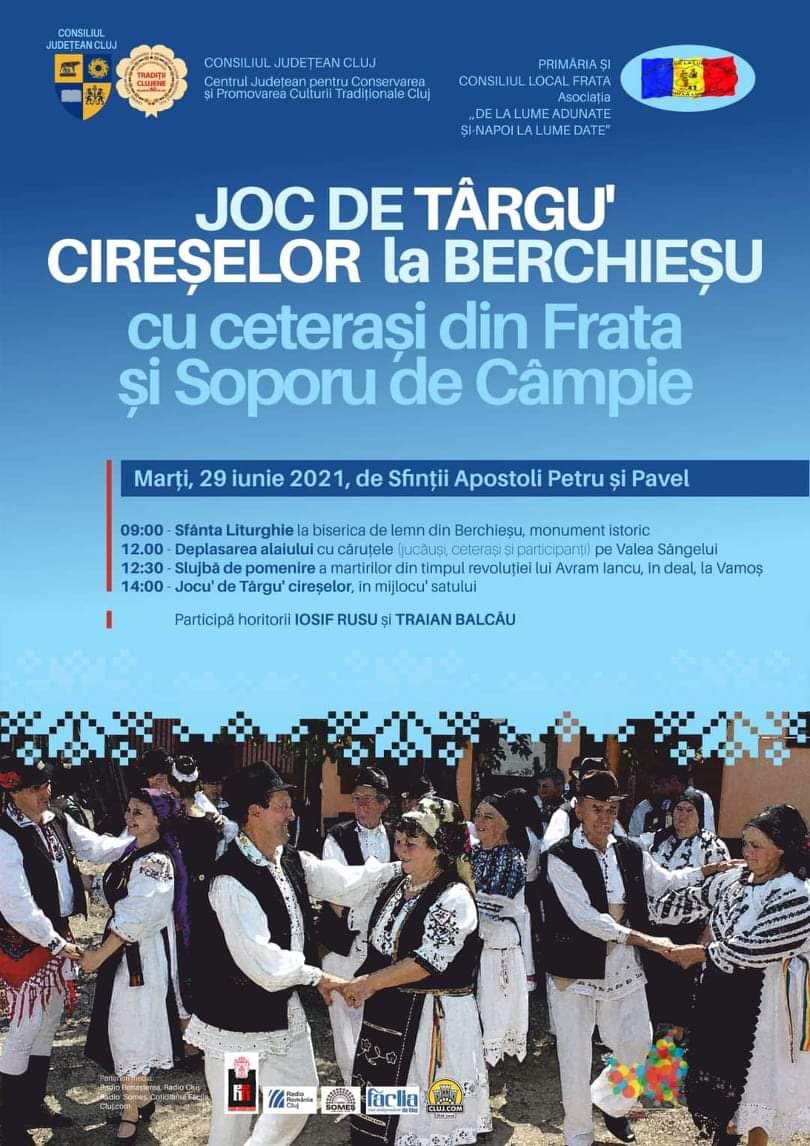 De sărbătoarea Sfinților Apostoli Petru și Pavel, marți, 29 iunie 2021, are loc la Berchieșu, județul Cluj, manifestarea tradițională „Joc de târgu’ cireșelor”. La evenimentul organizat de Asociația „De la lume adunate și-napoi la lume date” și Centrul Județean pentru Conservarea și Promovarea Culturii Tradiționale Cluj, instituție de cultură aflată în subordinea Consiliului Județean Cluj, cu sprijinul Primăriei și Consiliului Local Frata, vor lua parte ceterași din Frata și Soporu de Câmpie, dar și jucăuși din satele din zonă.