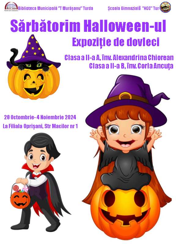 Biblioteca Municipală ”Teodor Murășanu” Turda în parteneriat cu Școala Gimnazială ”Horea, Cloșca și Crișan” Turda organizează în perioada 28 Octombrie- 4 Noiembrie 2024 expoziția de dovleci ”Sărbătorim Halloweenul”. Evenimentul are loc în cadrul Parteneriatului educațional din anul școlar 2024-2025, ”Educație, joc și creativitate”, dintre cele două instituții.