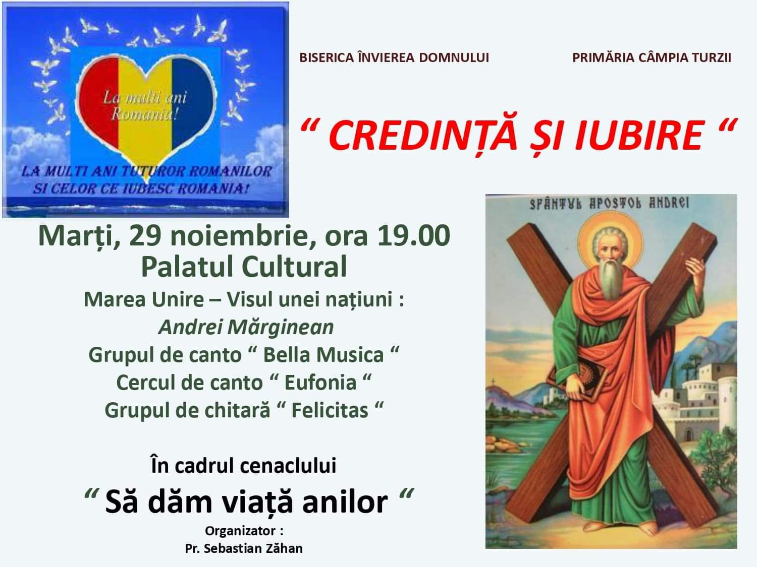 Marți, 29 noiembrie 202, de la orele 19.00, va avea loc, la Palatul Cultural din municipiul Câmpia Turzii, spectacolul „Credință și Iubire”, din cadrul Cenaclului „Să dăm viață anilor”.