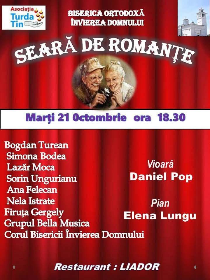 Asociația Turda Tin și Biserica Ortodoxă „Învierea Domnului” din Câmpia Turzii invită publicul marți, 21 octombrie, de la ora 18:30, la o Seară de Romanțe ce promite clipe de neuitat și o atmosferă plină de farmec.