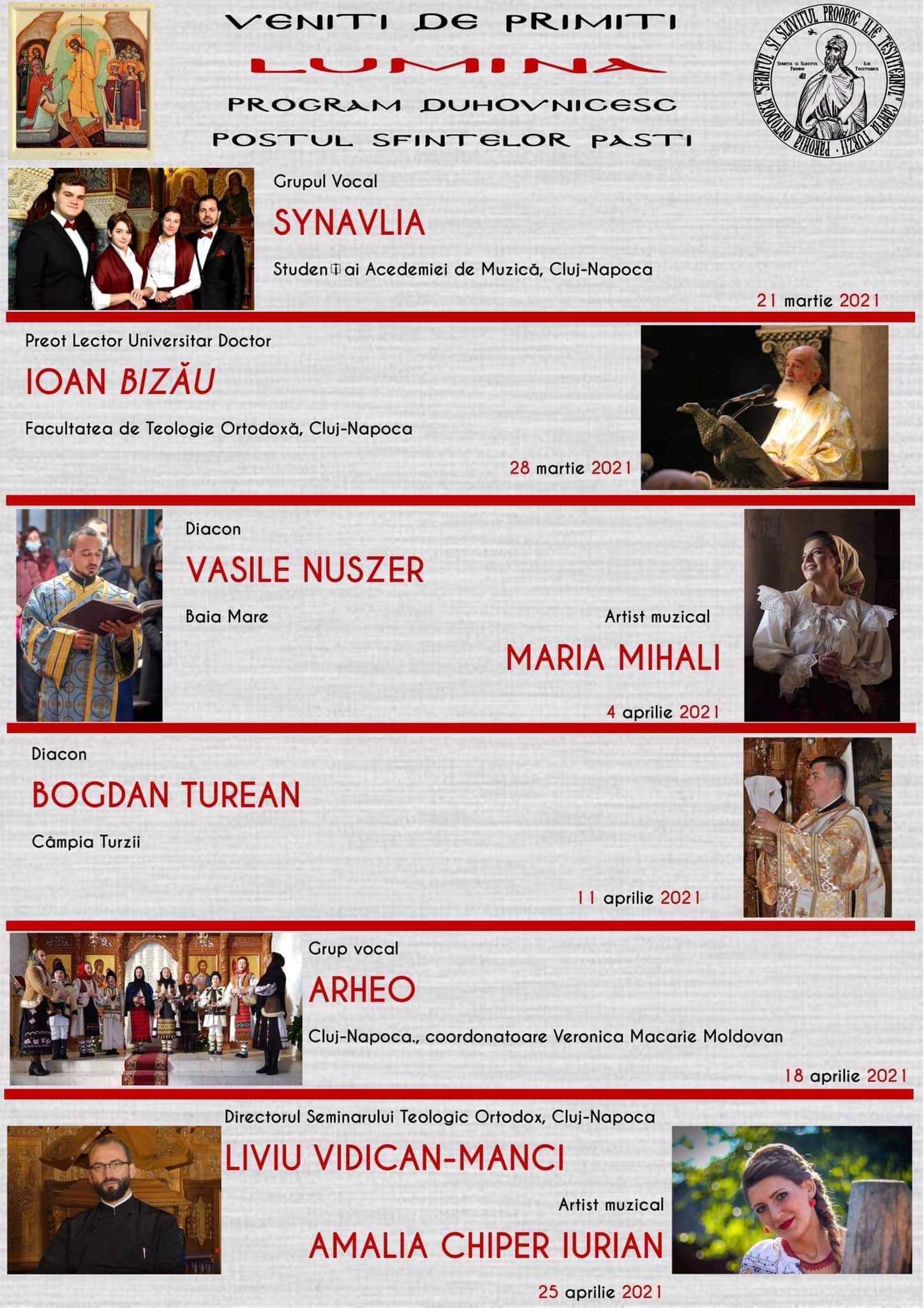 „Dragii noștri, după cum bine știți am intrat în perioada Postului Mare, motiv de cercertare și primenire sufletească, de intensificare a rugăciuni și a faptelor bune. Pentru a trăi mai cu seama acest timp al urcușului spre Înviere, parohia noastra vă propune un program duhovnicesc intitulat: “VENIȚI DE PRIMIȚI LUMINĂ ”. Pentru aceasta, în toate duminicile Postului Mare, vom căuta să diversificăm slujirea și trăirea din Sfânta Biserică, prin invitații noștri. Vă așteptăm alături de noi la Sfintele slujbe ale Bisericii noastre, pentru a fi părtași împreună de alese bucurii duhovnicești” Pr. Paroh Ratiu Raul George.
