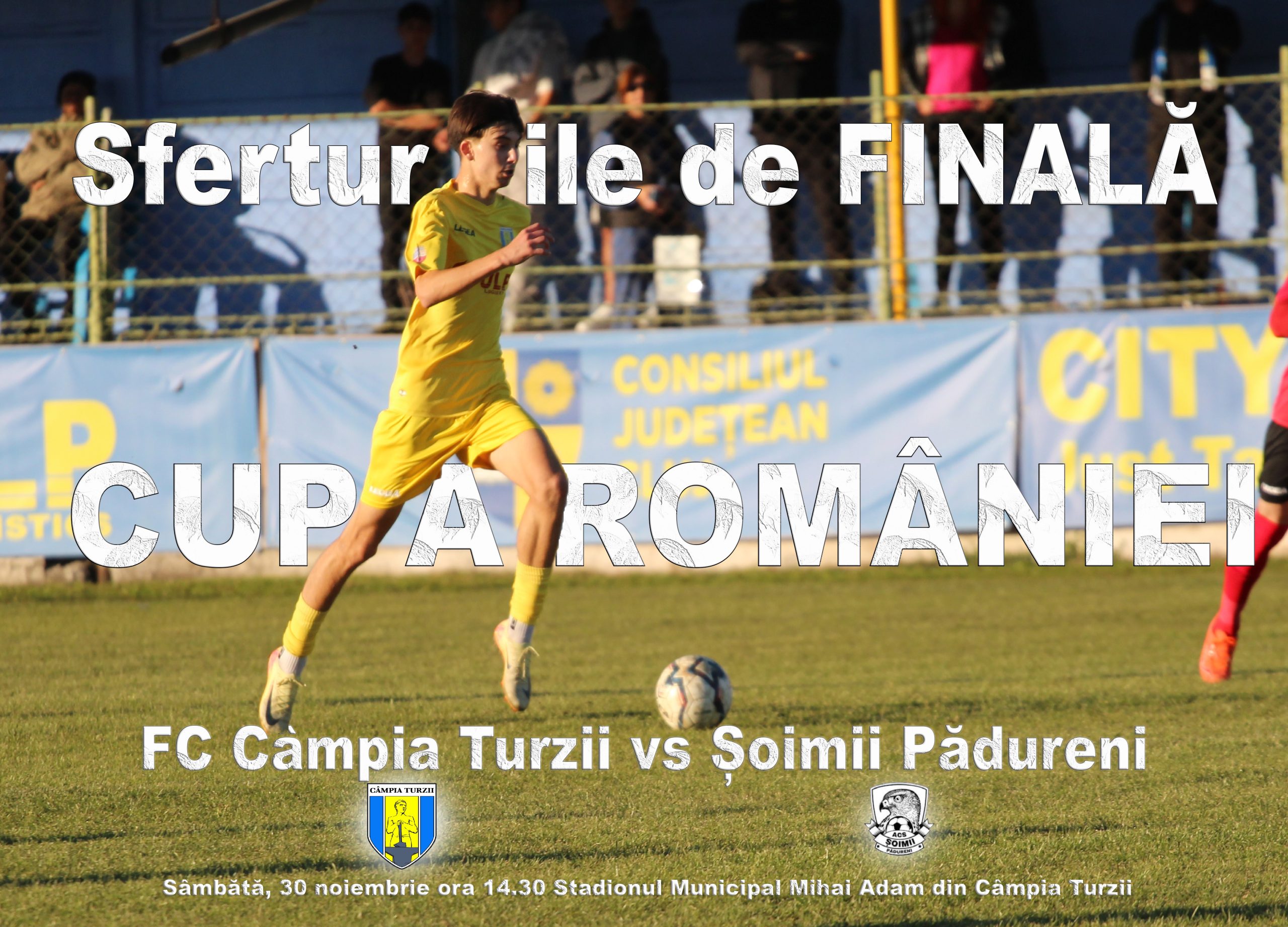 Sâmbătă, 30 noiembrie 2024 de la ora 14.30 pe Stadionul Municipal Sferturile de Finală ale Cupei României dintre FC Câmpia Turzii și Șoimii Pădureni.
