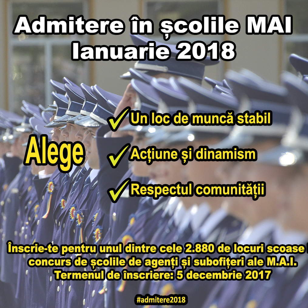 În perioada 13 – 21 ianuarie 2018, Şcoala de Agenţi de Poliţie „Septimiu Mureşan” Cluj-Napoca şi Şcoala de Agenţi de Poliţie „Vasile Lascăr” Câmpina vor organiza concurs de admitere pentru o nouă promoție de elevi. Durata studiilor de această dată este de 1 an.