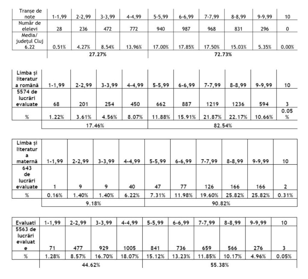 În județul Cluj, rezultatele obținute de elevii claselor a VIII-a, la simularea examenului de Evaluare Națională, sesiunea februarie 2024, evidențiază o rată a notelor peste 5,00 (cinci) de 72,73%. Pe tranșe de note și pe discipline, rezultatele elevilor clujeni se prezintă astfel: