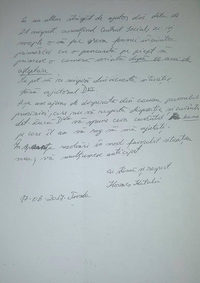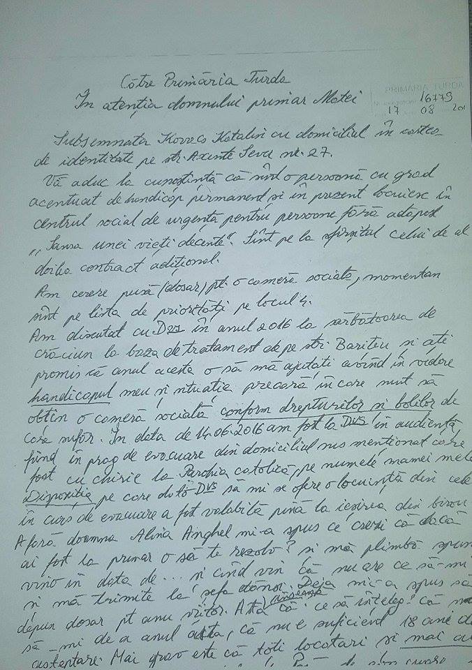 Au fost făcute toate demersurile, femeia fiind bolnavă cu handicap de gradul II și probleme grave la coloană, hernie, epilepsie și depresie, în cele din urmă aceasta a fost trecută pe poziția a patra pe lista de priorități. I s-a spus că imediat ce se vor evacua câteva locuințe va primi mult așteptata cameră, însă suntem deja în luna august iar locuințe au fost evacuate doar două și i s-a cerut să depună cerere pe anul 2018.