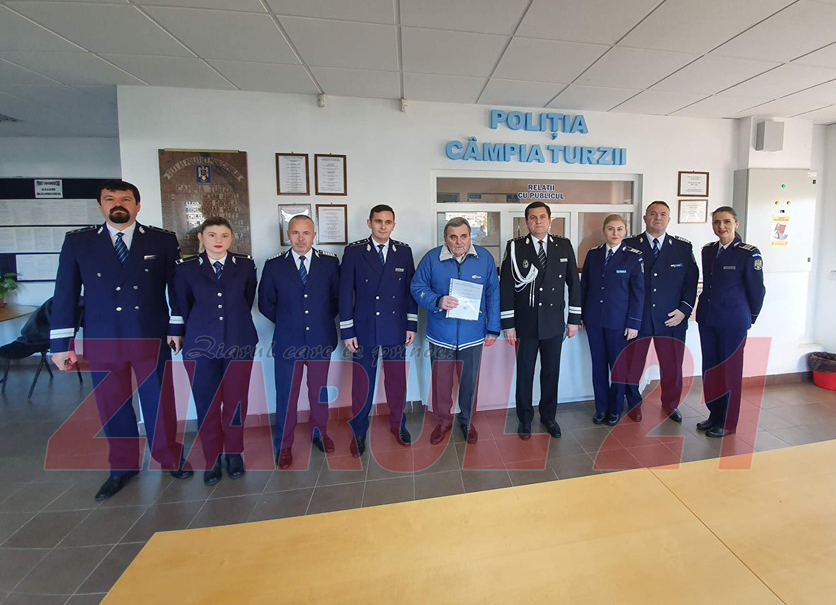 Duminică, 1 decembrie, Șeful Poliției Municipiului Câmpia Turzii, Dorel Fodorean, i-a oferit o diplomă de merit unui cetățean din Câmpia Turzii pentru faptul că acesta a găsit un portofel plin cu bani și documente și l-a dus imediat poliției.