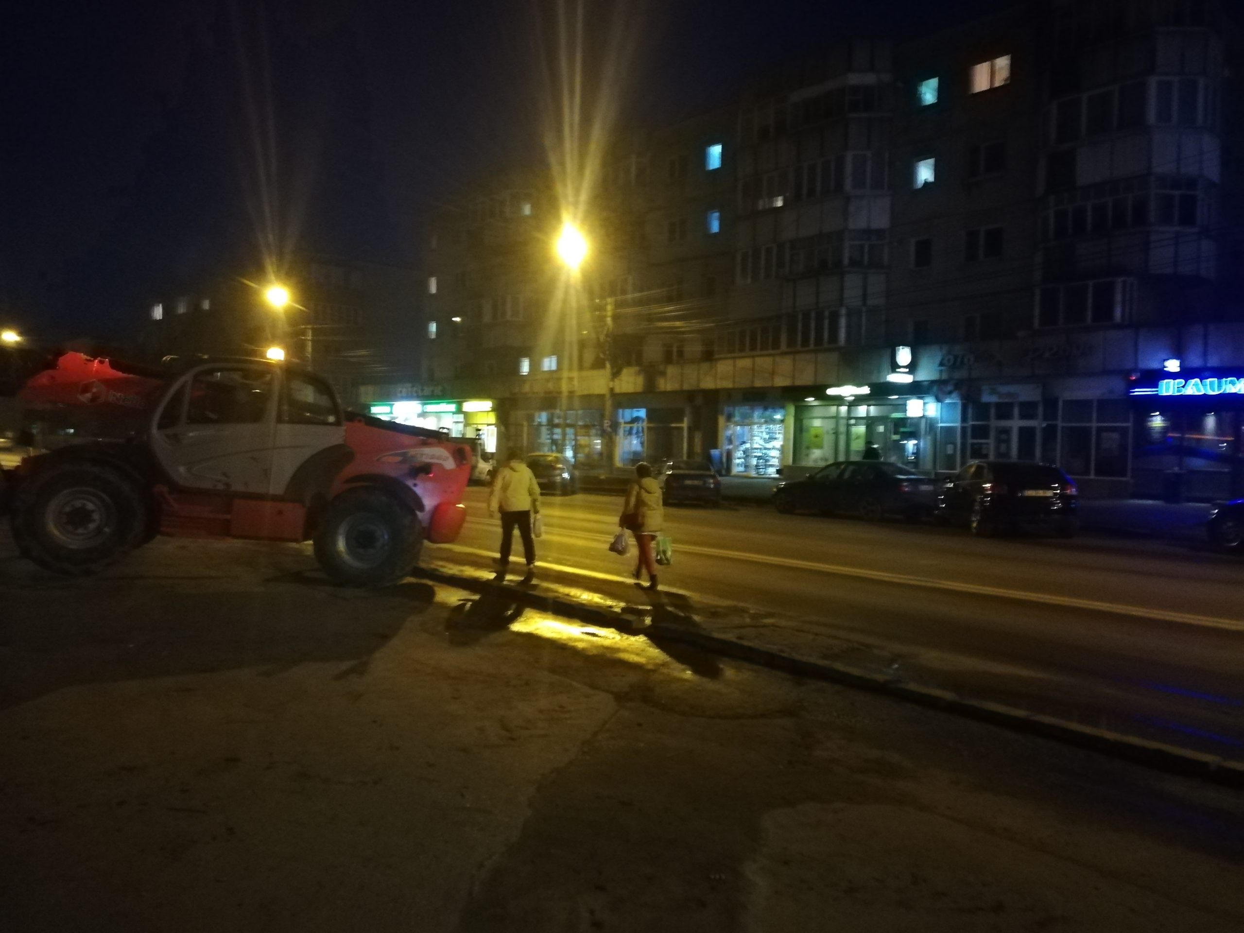 „În această seară, (25.11.2019) venind de la Kaufland, vis-a-vis de sala de jocuri Baum Games, acest utilaj era parcat atât pe trotuar cât și în parcare, în așa fel încât pietonii nu mai aveau posibilitatea să treacă prin zonă. Pentru că nu aveam pe unde să trec, datorită faptului că utilajul bloca accesul pietonilor, am solicitat foarte frumos, persoanei care manevra utilajul să îl mute puțin cât timp nu îl folosește, pentru ca pietonii nu au pe unde sa mai circule.