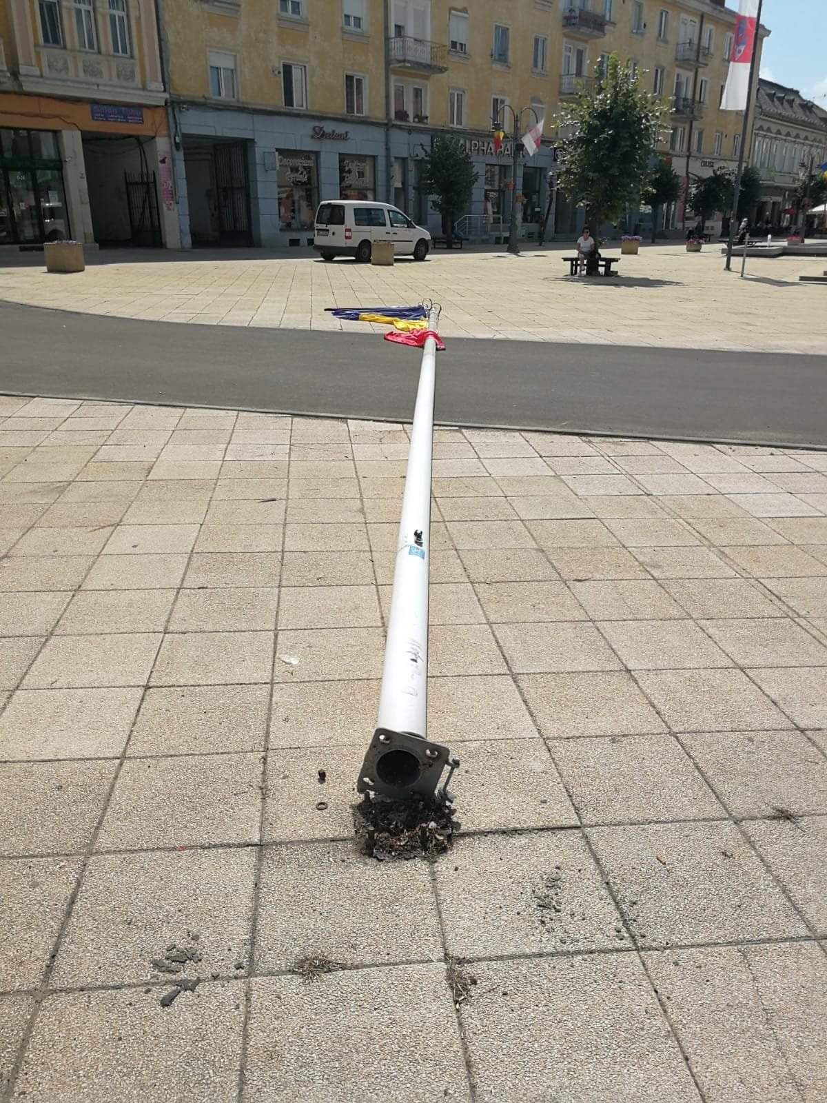 În această dimineață un șofer neatent a intrat ilegal cu autoturismul în zona pietonală din spatele statuii Avram Iancu și a lovit catargul pe care este arborat drapelul tricolor.