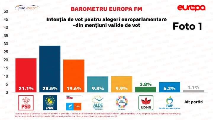 Potrivit datelor din BAROMETRU EUROPA FM din luna mai, PNL crește în opțiunile valide de vot, ajungând la 28,5%, PSD adună 21,1%, în scădere față de aprilie, iar a treia formațiune în opțiunile participanților la sondajul IMAS, realizat la comanda Europa FM, este Alianța 2020 USR – PLUS, cu 19,6%.