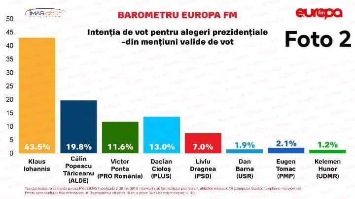În ceea ce privește opțiunile de vot pentru alegerile prezidențiale, dacă acestea ar avea loc duminică, Klaus Iohhanis ar fi primul clasat, cu 43,5%, într-o ușoară creștere comparativ cu luna aprilie, fiind urmat de Călin Popescu Tăriceanu(19,8%) și Dacian Cioloș (13%). Liviu Dragnea coboară în opțiunile de vot cu 1,7% față de luna aprilie, având acum doar 7,0% din mențiunile valide de vot.