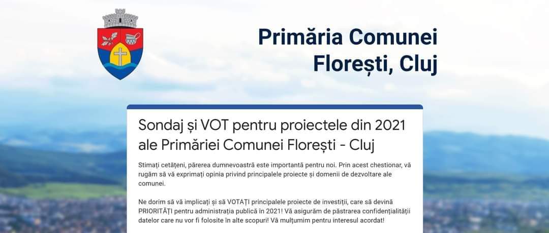 Sondaj și VOT pentru proiectele din 2021 ale Primăriei Comunei Florești – Cluj: https://sondaj.floresticluj.ro/