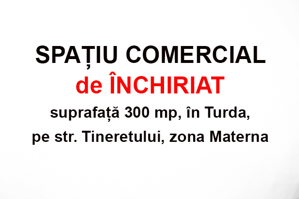 Intreprindere individuala ofera spre inchiriere un spatiu comercial cu o suprafata de aprox. 300 mp, in Turda, pe str. Tineretului, zona Materna. In acest moment acesta functioneaza ca si sala de fitness si dispune de toate utilitatile pentru a putea desfasura activitatea imediat. Pentru vizionare sau alte detalii va stam la dispozitie la numarul de telefon: 0760 233 606.