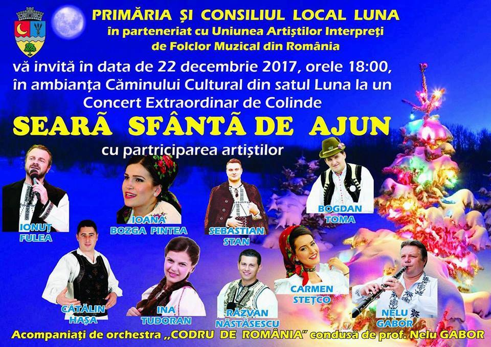 Primăria și Consiliul local al comunei Luna, în parteneriat cu Uniunea Artiștilor Interpreți de Folclor Muzical Românesc organizează vineri, 22 decembrie, concert extraordinar de Colinde: Seară Sfântă de Ajun.