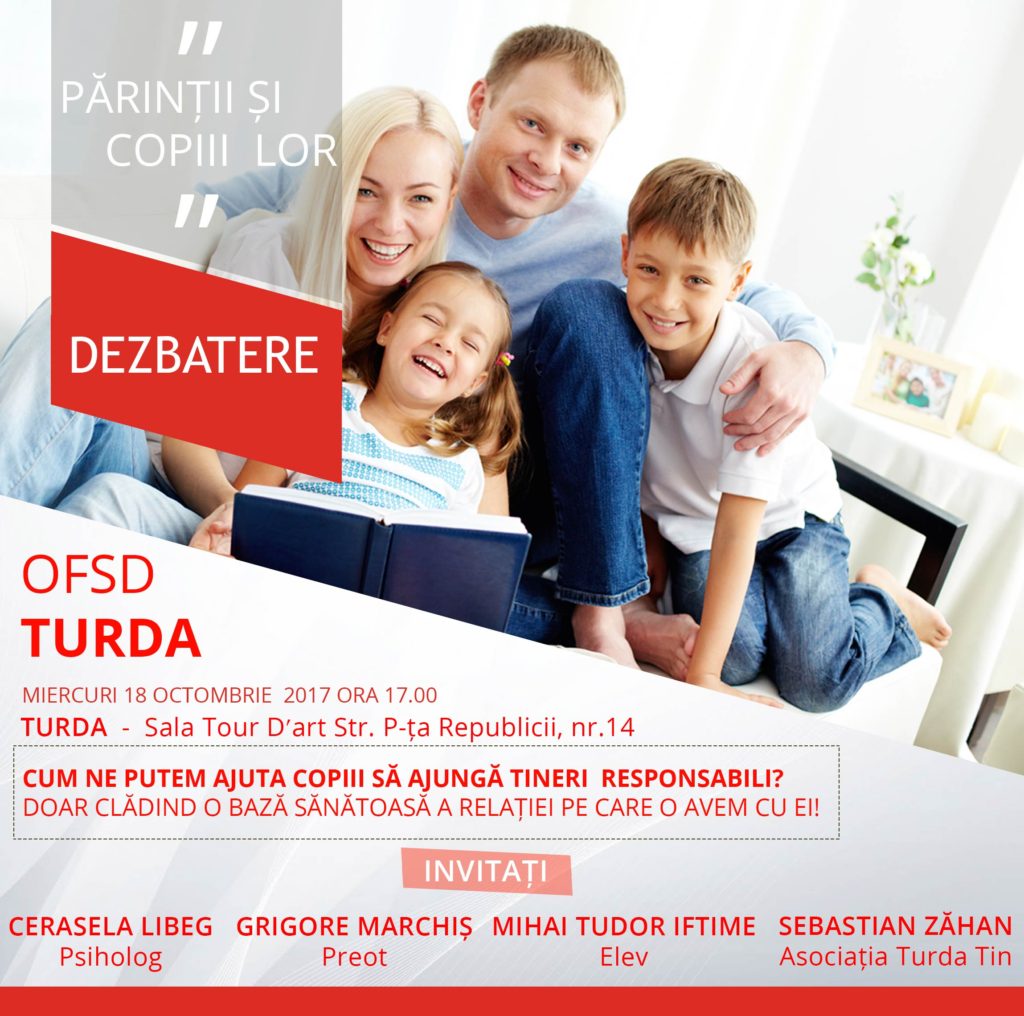 Miercuri, 18 octombrie 2017, începând cu ora 17.00, la sala Tour D’art, str. P-ța Republicii, nr.14, Organizația Femeilor Social Democrate Turda, va organiza dezbaterea cu tema: „Părinții și copiii lor”, destinată părinților, copiilor, adolescenților și cadrelor didactice.