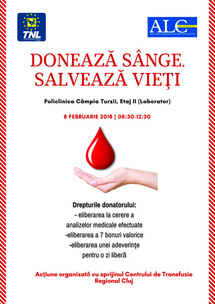 Organizaţia de tineret a Partidului Naţional Liberal Câmpia Turzii împreună cu Asociaţia Liberalism pentru Comunitate organizează o nouă campania de donare de sânge “Donează sânge. Salvează vieţi”.