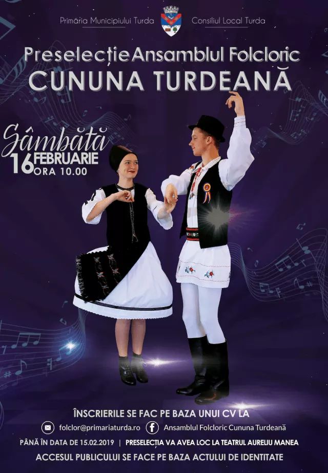 Înscrierile se fac pe baza unui CV, la adresa de email: folclor@primariaturda.ro și adresa de Facebook: Ansamblul Folcloric Cununa Turdeană, până la data de 15.02.2019.