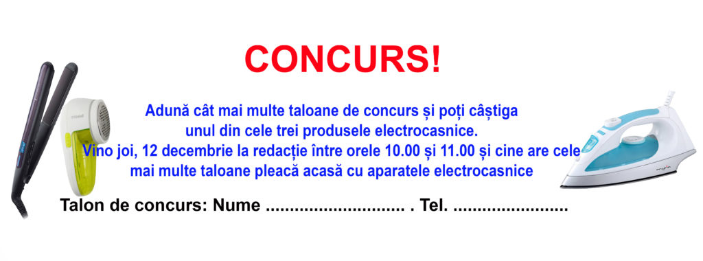 Adună cât mai multe taloane de concurs de pe prima pagină a Ziarului 21 și vino joi, 12 decembrie la redacția ziarului între orele 10.00 și 11.00 și poți pleca acasă cu premiile!