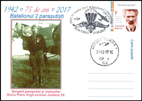 Filatelistul turdean Petru Suciu a tipărit 13 cărți poștale, pentru a omagia astfel împlinirea, la 31 martie, a 75 de ani de la înființarea Batalionului 2 Parașutiști București. Cele 13 cărți poștale, tipărite ca urmare a inițaitivei personale a lui Petru Suciu, președinte al Cercului filatelic din Turda, îl înfățișează pe tatăl acestuia, sergentul Petru Suciu, instructor parașutist, până în 20 februarie 1945, în Batalionul 2 Parașutiști.