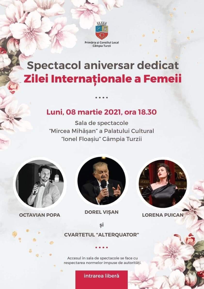 Luni, 8 martie 2021, de la ora 18:30, Primăria și Consiliul Local al Municipiului Câmpia Turzii, organizează un spectacol aniversar dedicat doamnelor și domnișoarelor din municipiul nostru.