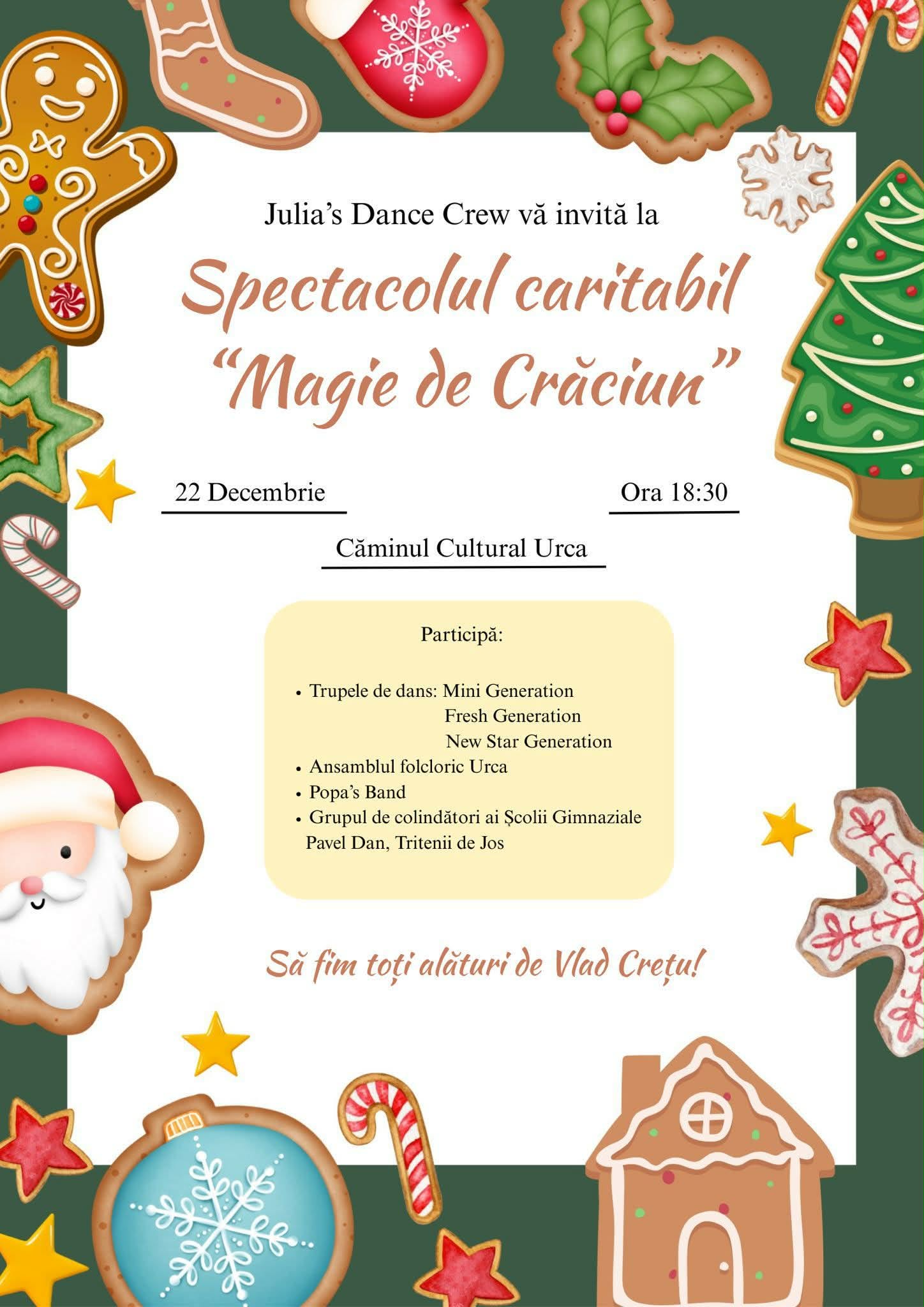 Spiritul sărbătorilor de iarnă prinde viață la Urca, unde Julia’s Dance Crew invită întreaga comunitate la spectacolul caritabil „Magie de Crăciun”, un eveniment dedicat solidarității, emoției și bucuriei de a dărui.