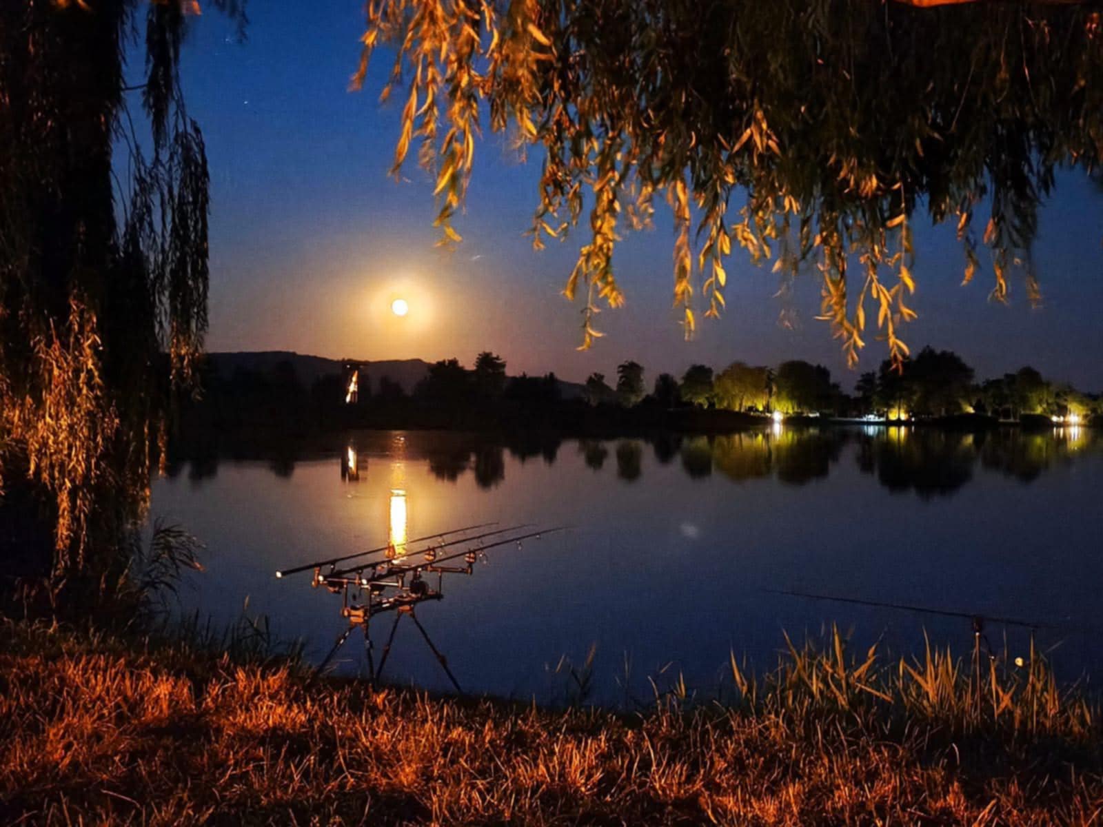 Imaginea dezvăluie o scenă de o liniște profundă: lansetele pescarilor pregătite pe mal, lumina caldă a lunii, ramurile sălciilor care coboară ușor peste apă și siluetele copacilor scăldate în licăriri discrete ale luminilor de pe mal. Totul contribuie la un tablou nocturn aproape ireal, o oază de liniște pentru pasionații de pescuit și natură.