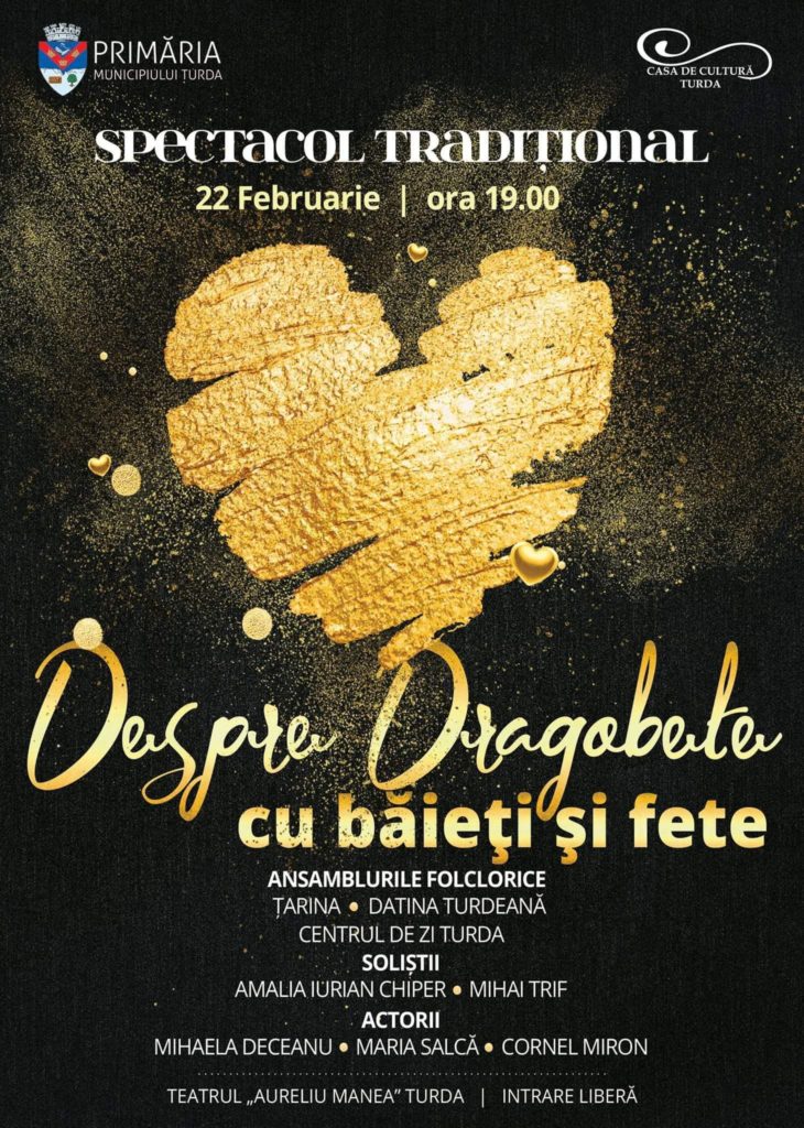 Tradiția românească a iubirii va fi sărbătorită la Turda prin spectacolul „Despre Dragobete cu băieți și fete”, la care vă invităm să participați în data de 22 februarie 2019,ora 19,00 la Teatrul „Aureliu Manea”.