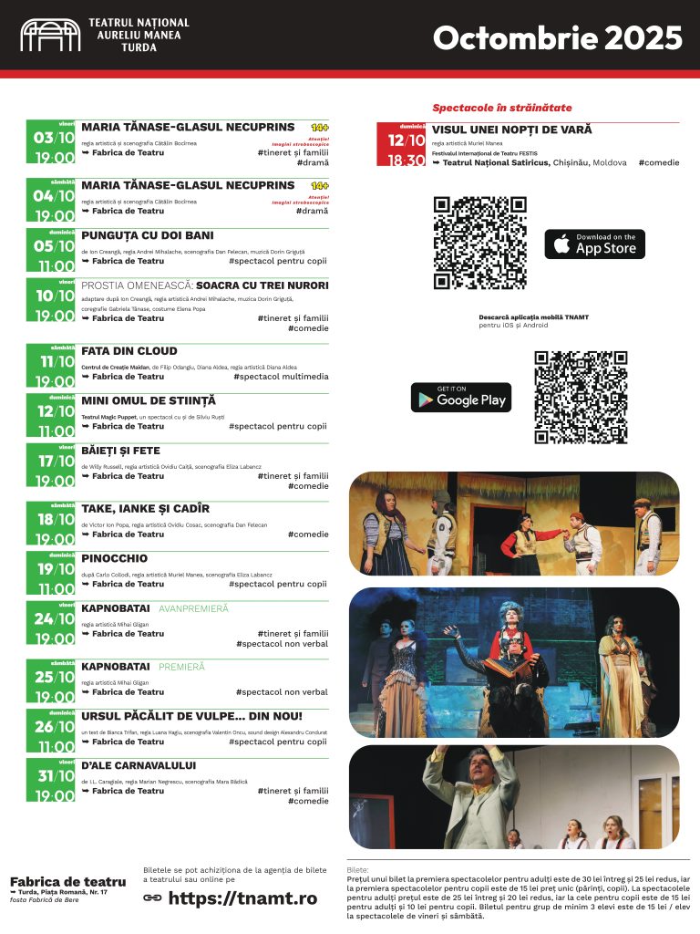 Vineri seara, de la ora 19:00, TNAMT oferă emoții atât pentru publicul tânăr cât și pentru familiile care își doresc o experiență culturală de neuitat. Titluri îndrăgite, din repertoriul teatrului: „Maria Tănase-glasul necuprins” – un spectacol care readuce în fața spectatorilor vocea și personalitatea celei supranumite „Pasărea Măiastră” a cântecului românesc. O seară de muzică, emoție și tradiție, în care farmecul artistei trăiește din nou pe scenă. „Soacra cu trei nurori” – poveste clasică, plină de haz și învățăminte, care ne aduce aminte cât de actuale pot fi basmele populare. „D’ale carnavalului” – comedia spumoasă a lui Caragiale, cu personaje pitorești și situații savuroase care, de mai bine de un secol, fac deliciul spectatorilor.