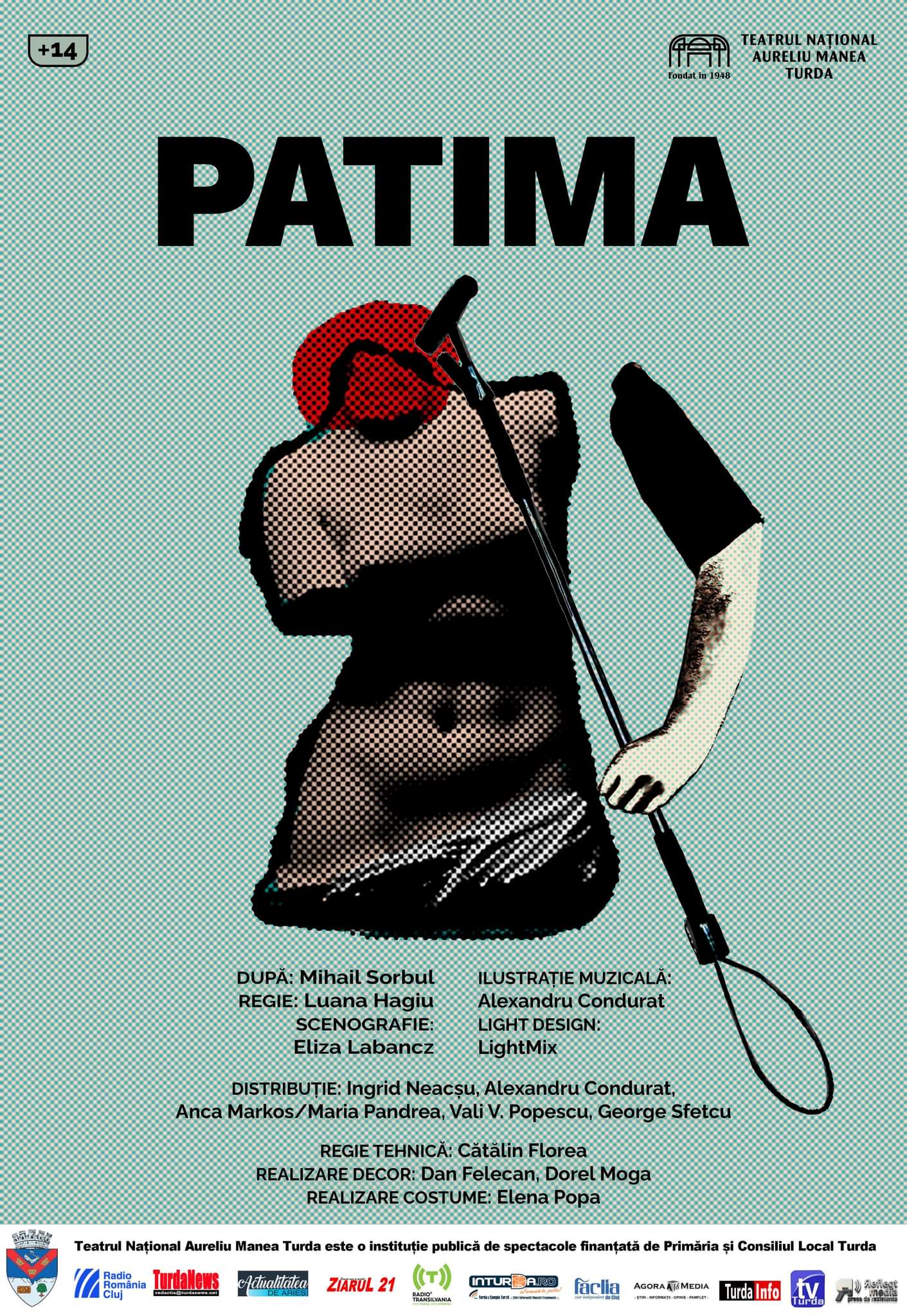 “Patima” este o poveste atemporală despre îndrăgostire, despre iubire, și despre viciu. Este o poveste văzută atât din interiorul evenimentelor, cât și dintr-un punct exterior – de obiectivitate – al personajelor, care ne oferă indicii despre gândurile lor după unele scene care le schimbă parcursul. Pornit de la textul lui Mihail Sorbul, “Patima roșie”, spectacolul este format dintr-o serie de scene care au pornit ca improvizații pe temele din text, astfel păstrându-se ideea lui Sorbul, însă oferindu-se publicului o altă viziune asupra ei. Un amestec de cereri în căsătorie, muzică, dans, umor și tragic, “Patima” este exact ca viața: un pic surprinzătoare.