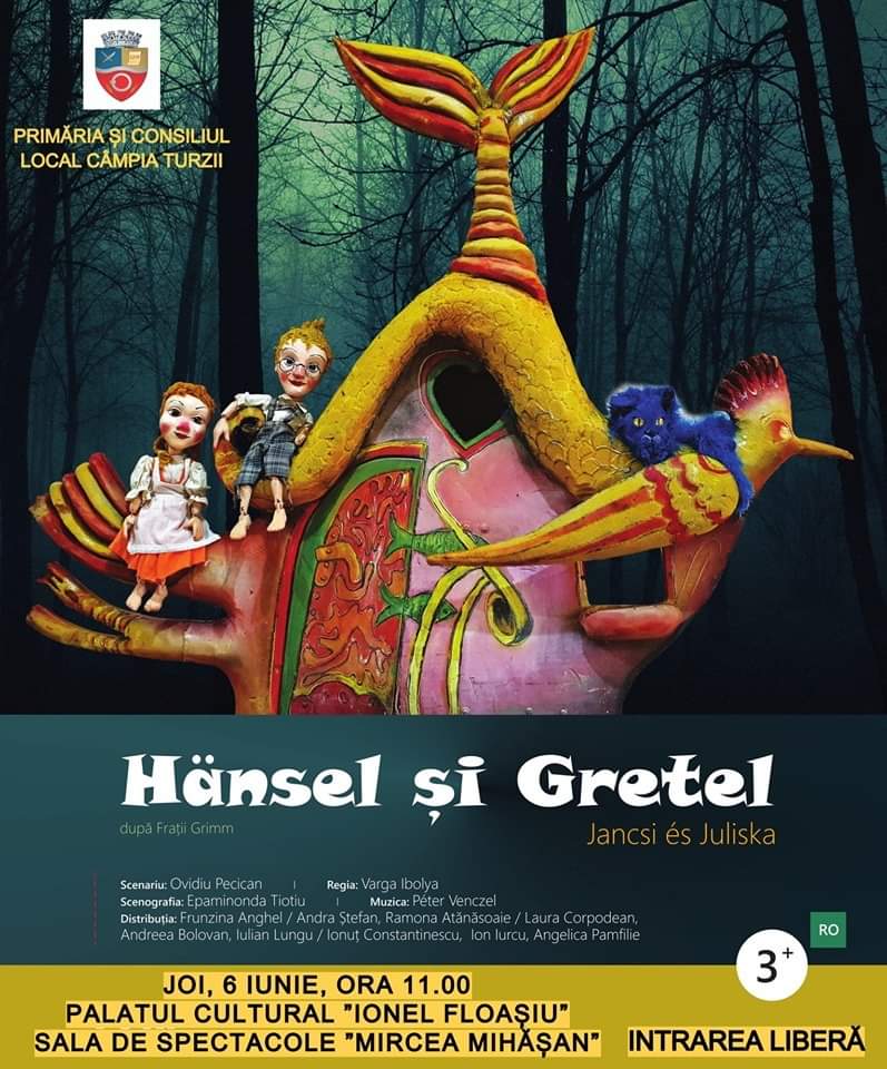 Așadar, dragi părinți, vă așteptăm, alături de cei mici, joi 6 iunie 2019, începând cu orele 11:00 în Sala de Spectacole „Mircea Mihășan” a Palatului Cultural „Ionel Floașiu”, din Câmpia Turzii pentru a vă distra și a râde alături de Hansel și Gretel.