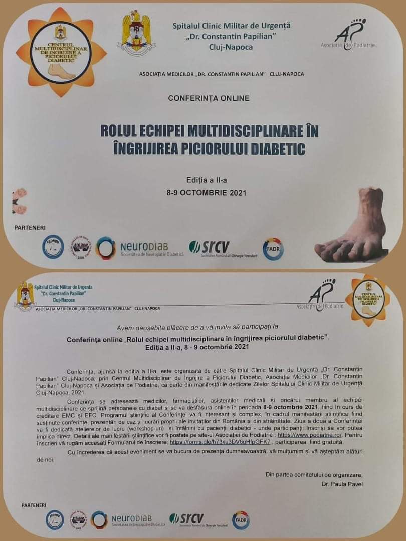 În perioada 08-09 octombrie 2021, Spitalul Clinic Militar de Urgență „Dr. Constantin Papilian” Cluj-Napoca, prin Centrul Multidisciplinar de Îngrijire a Piciorului Diabetic și cu sprijinul Asociației Medicilor „Dr. Constantin Papilian” și Asociației de Pediatrie organizează Conferința online „Rolul echipei multidisciplinare în îngrijirea piciorului diabetic”, ediția a II-a.
