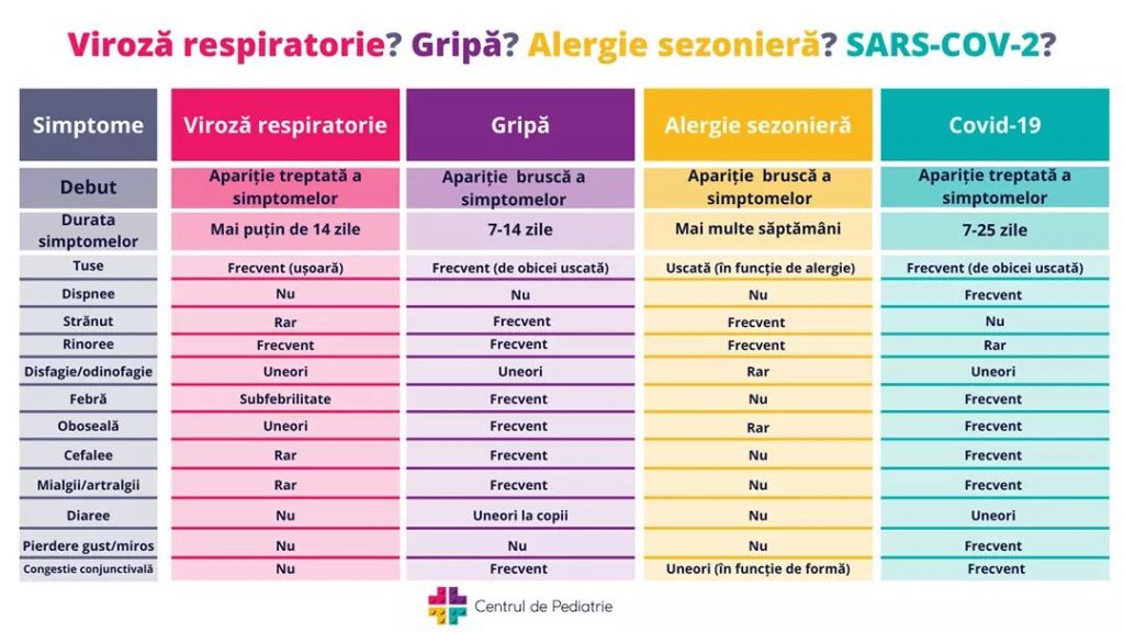Medicii de la Centrul de Pediatrie au pregătit însă o situație comparativă a simptomelor acestor boli, sub forma unui tabel, care poate fi un mic ghid pentru această perioadă.
