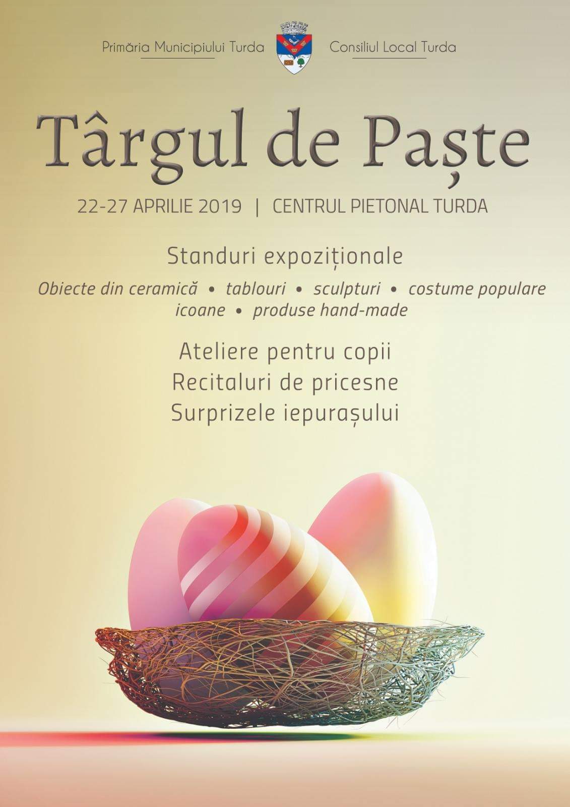Primăria și Consiliul Local Turda organizează tradiționalul TÂRG DE PAȘTE în perioada 22 – 27 aprilie în Centrul Pietonal Turda, unde veți găsi standuri expoziționale ale meșterilor populari cu obiecte de ceramică, artă plastică, icoane, costume populare, produse hand-made specifice sărbătorilor pascale.