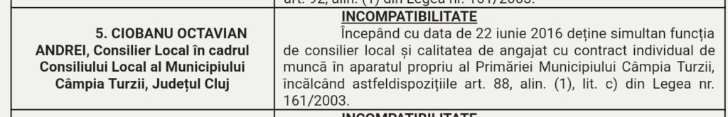Începând cu data de 22 iunie 2016 deține simultan funcția de consilier local și calitatea de angajat cu contract individual de muncă în aparatul propriu al Primăriei Municipiului Câmpia Turzii, încălcând astfel dispozițiile art. 88, alin. (1), lit. c) din Legea nr. 161/2003.