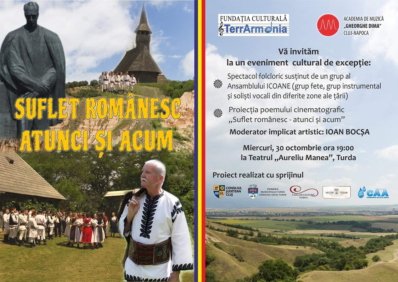 SUFLET ROMÂNESC – ATUNCI ȘI ACUM – așa se intitulează evenimentul cultural care aduce în fața publicului turdean spiritualitatea românească, printr-un spectacol folcloric sinteză a zonelor tradiționale și prin proiecția poemului cinematografic ,,Despre muzica poeziei și poezia muzicii”.