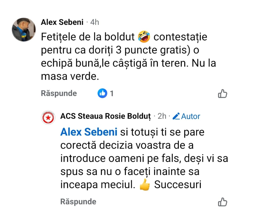 Situația a degenerat însă și în mediul online, acolo unde unii jucători de la Spicul Luna au ironizat adversarii de la Steaua Roșie Bolduț pentru contestația depusă, numindu-i „fetițe” și acuzându-i că „vor să câștige puncte la masa verde”.