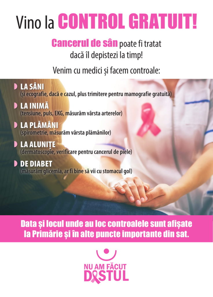 Federatia Asociatiilor Bolnavilor de Cancer (FABC), in parteneriat cu Asociatia Pacientilor Cronici din Romania, organizeaza a 5-a editie a campaniei „Nu am facut destul”, care are ca scop testarea gratuita pentru depistarea cancerului la san in randul femeilor din mediul rural.