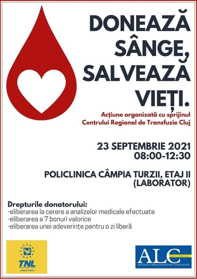 Campania „Donează sânge. Salvează vieţi” va avea loc în data de 23 septembrie 2021, în incinta Policlinicii Câmpia Turzii, Etajul II (Laborator), între orele 08:00 şi 12:30, în parteneriat cu Centrul Regional de Transfuzie Cluj și Spitalul Municipal „Dr. Cornel Igna” Câmpia Turzii.