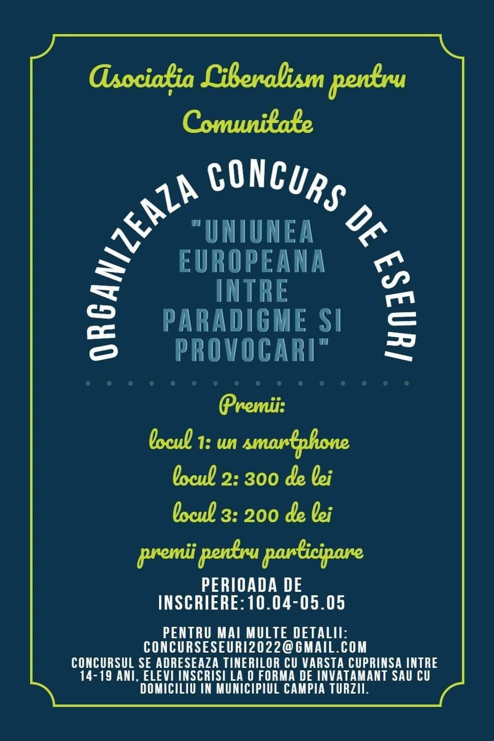 Organizarea concursului de eseuri pe tema “𝙐𝙣𝙞𝙪𝙣𝙚𝙖 𝙀𝙪𝙧𝙤𝙥𝙚𝙖𝙣ă î𝙣𝙩𝙧𝙚 𝙥𝙖𝙧𝙖𝙙𝙞𝙜𝙢𝙚 ș𝙞 𝙥𝙧𝙤𝙫𝙤𝙘ă𝙧𝙞” face parte din programul inițiat.