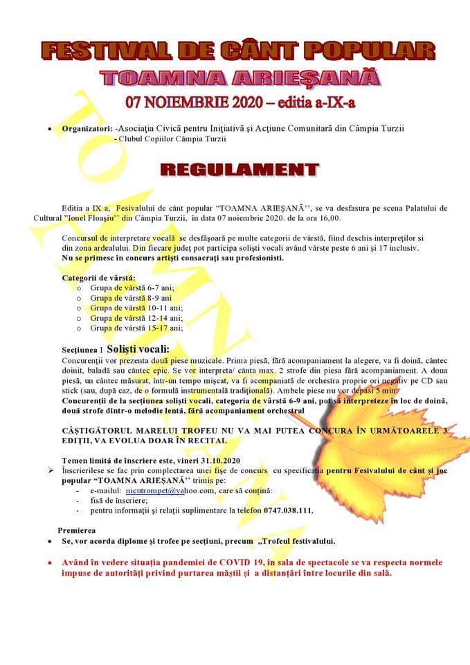 „Ediția a IX a, Festivalului de cânt popular “TOAMNA ARIEȘANĂ’’, se va desfășura pe scena Palatului de Cultural ”Ionel Floaşiu’’ din Câmpia Turzii, în data 07 noiembrie 2020. de la ora 15.00. Concursul de interpretare vocală se desfăşoară pe mai multe categorii de vârstă, fiind deschis interpreţilor și din zona Ardealului. Din fiecare judeţ pot participa solişti vocali având vârste peste 6 ani și 17 ani inclusiv. Nu se primesc în concurs artişti consacraţi sau profesionisti.