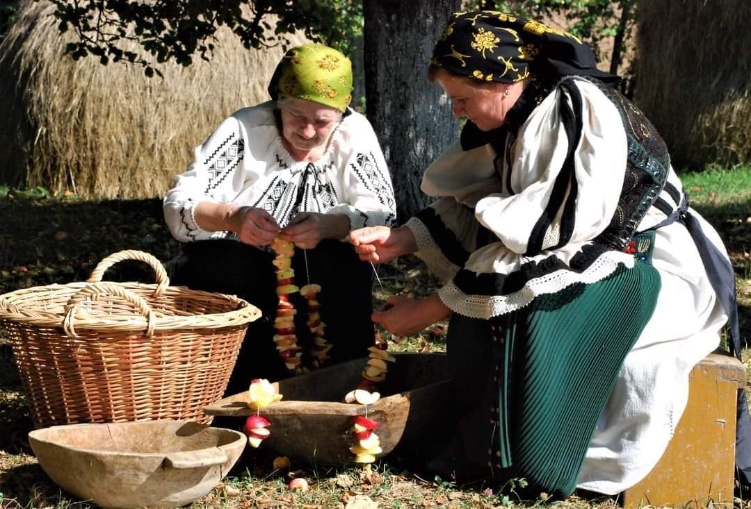 Femei din Râșca, jud. Cluj, pregătind merele pentru uscat