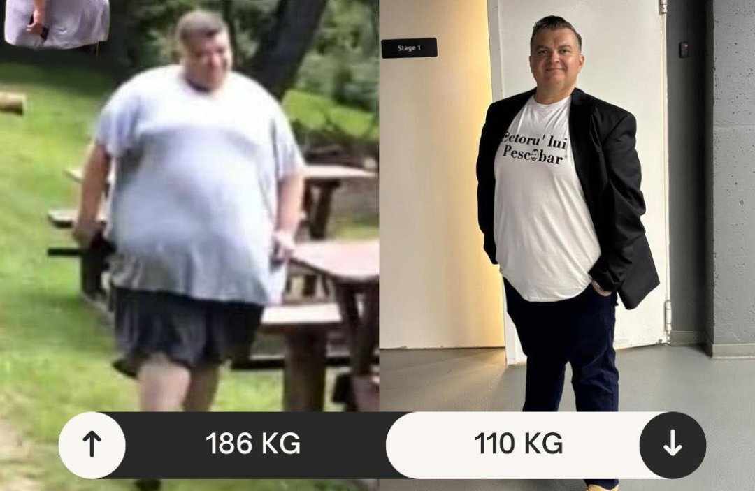 Cunoscut în comunitate și pe rețelele de socializare sub pseudonimul „Doctorul lui Pescobar”, acest profesionist în domeniul fondurilor europene a slăbit nu mai puțin de 76 de kilograme, trecând de la 186 kg la 110 kg.