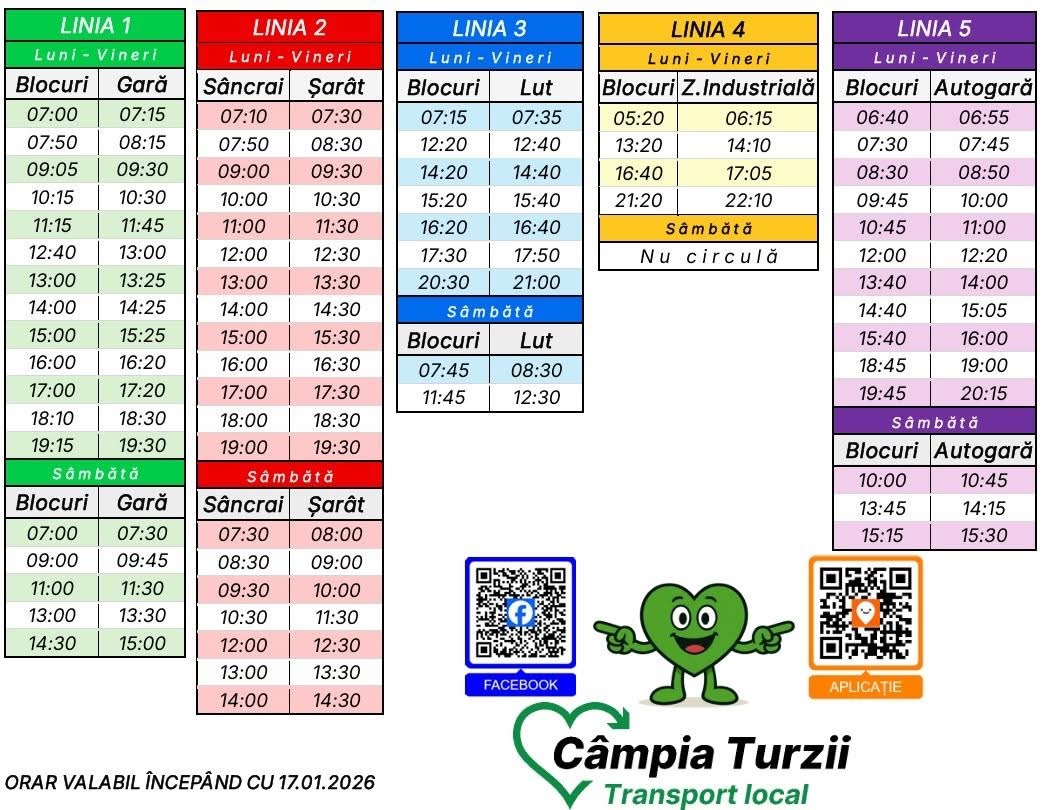 Transport Local Câmpia Turzii informează că, începând cu data de 17 ianuarie 2026, intră în vigoare noul program de circulație pentru toate liniile de transport local.