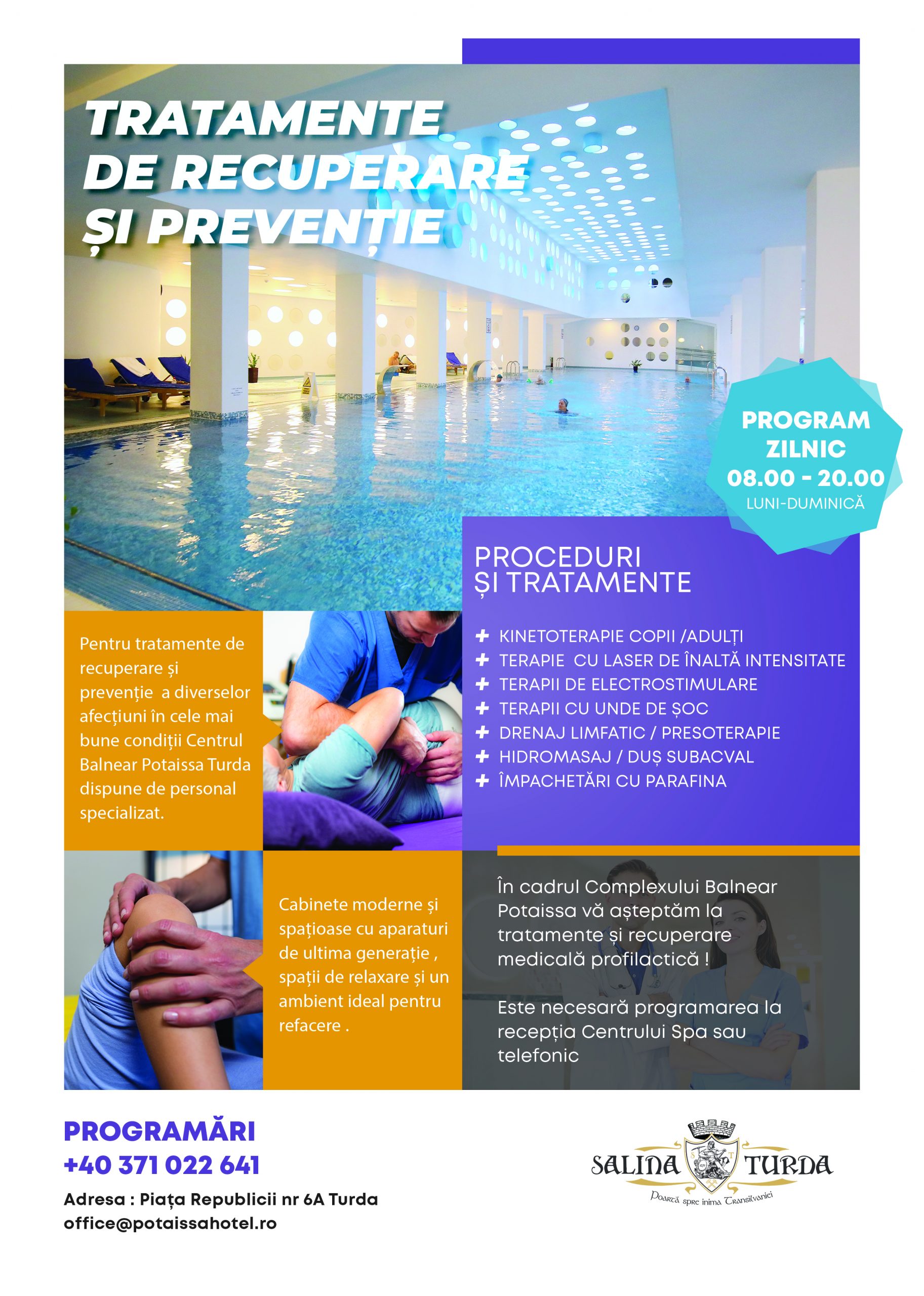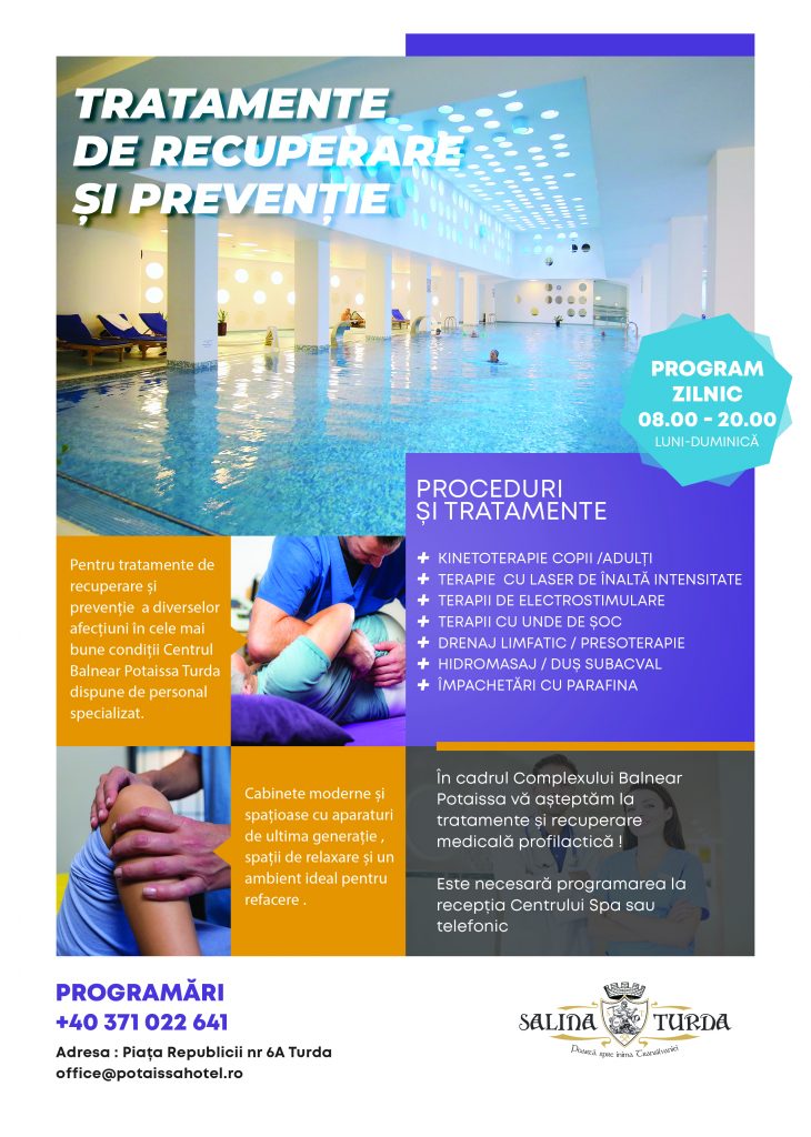 Fizioterapia este o soluție adecvată pe care noi v-o oferim imediat! Pentru mai multe informații și programări, vă stăm la dispoziție la tel. 0371 022 641 sau office@potaissahotel.ro