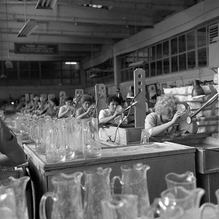 Într-o fotografie document surprinsă în anul 1987, vedem un colț de istorie industrială al Turzii – Atelierul de gravură al Fabricii de Sticlă. Într-o atmosferă concentrată și plină de migală, muncitoarele fabricii dau viață obiectelor din sticlă, transformând simple carafe și pahare în adevărate opere de artă.